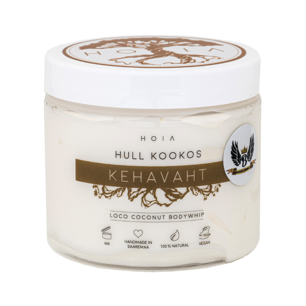 HOIA kehavaht Hull Kookos sisaldab rikkalikult rafineerimata sheavõid, kookosõli, kakaovõid ning teisi taimseid õlisid, mis niisutavad ja hooldavad nahka sügavuti, pidurdavad naha enneaegset vananemist ning kaitsevad seda väliskeskkonna kahjulike mõjude eest.